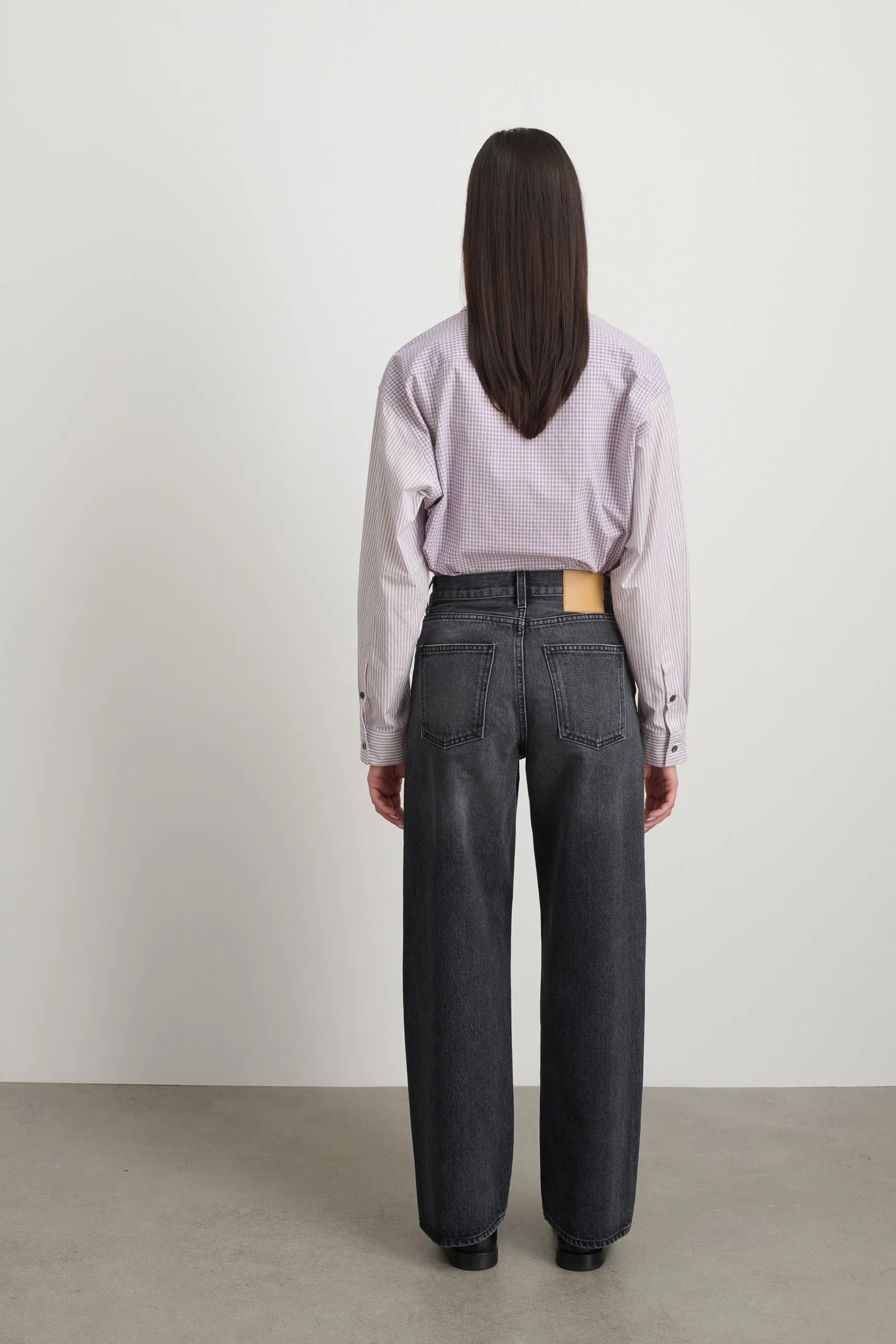 Our Elissa Jean-- Jeans inspired by chance run-in's with longtime friend and collaborator Elissa Santisi and her timeless downtown ease. Cut from cotton rich black/black yarn dyed denim, that is stone washed for a tailored broken-in look. Designed to sit high on the waist, close to the hip and fall into a relaxed wide-leg silhouette.