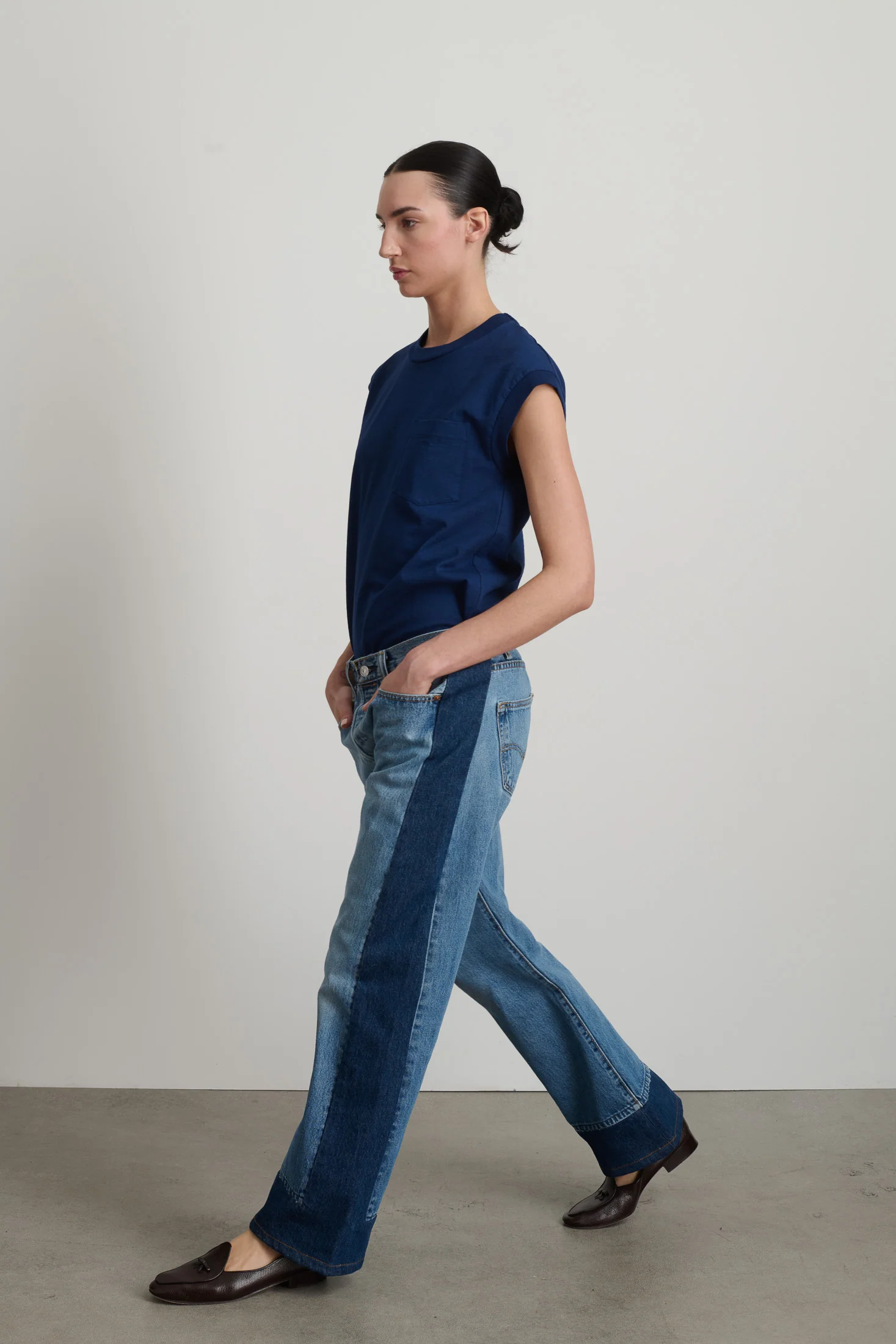 Cool and very relaxed, introducing our Reworked Slouch-- Tailored from vintage Levi's 501’s and 505's, for a classic low waisted, mid-rise fit. Each pair is unique, constructed from upcycled vintage and overdyed denim.