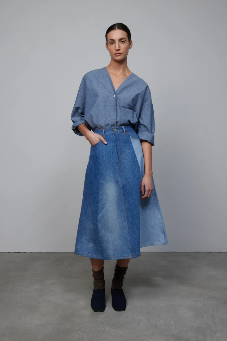 Introducing our Simone Skirt-- Upcycled and one-of-a-kind, a classic A-line midi length skirt, cut from a collection of 1970's and 80's vintage blue jeans. Classic marigold single needle tailoring, with front zip fly closure and brass button hardware to finish each piece.