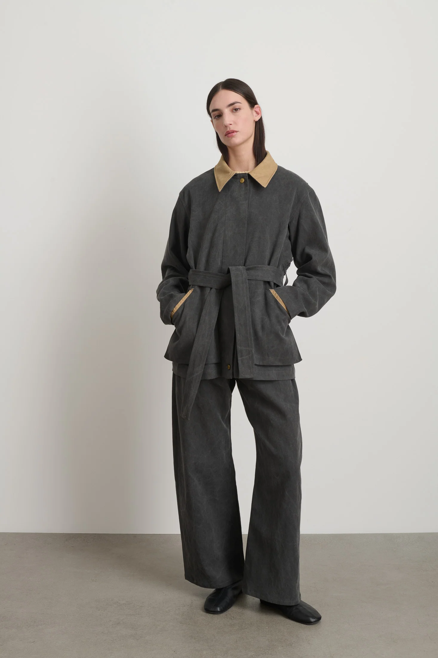 A hand sewn country jacket in sueded cotton Italian denim twill, with collar and pocket binding finished in camel waxed canvas.